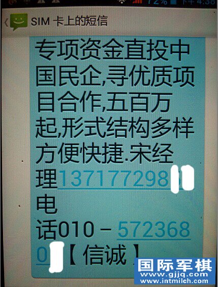 风头公司短信 “专项资金直投中国民企,寻优质项目合作,五百万起,形式结构多样方便快捷,宋经理137177298xx”,电话010——57236807x【诚信】。”当时,张家来想:现在手机经常出现中奖的短信,以为是诈骗,就没有回复和咨询。 春节前,张家来又收到同样的短信,打开一看:短信信息达到110多条,才知道短信塞满了新短信就进不来了,然后就一个一个的删除,在删除了很多短信后,发现一条半年多的500万风投短信,于是拨通了风投公司宋经理手机。 电话那头的宋经理说:“我们是河北承德的,做风投四五年了。” 张家来说:“你给国际军棋上做风投。”宋经理说:“是的”。宋经理说: “你把国际军棋的具体投资计划写出来吧。” 随后张家来就与宋经理开始了QQ联系,随着Q聊的继续,对方了解了国际军棋的许多事情,张家来也知道了他们风险投资的动向,半年后,国际军棋后期完善还没完,就未通知媒体宣传推广,特别是《国际军棋发明的历史渊源》、《国际军棋的战略性、娱乐性和经济性》等系列陈述没有写完,所以才未给风头公司回信。